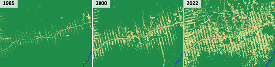 Figura 2 – Expansão das áreas de pasto (em amarelo) sobre as áreas de floresta (em verde) nos municípios de Uruará e Placas/PA entre 1985 e 2022