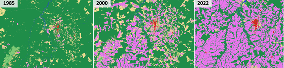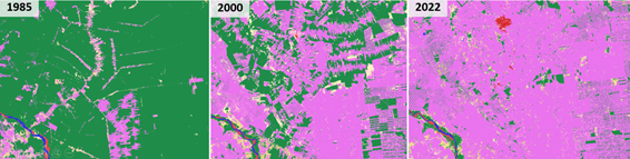 Figura 4 – Expansão das áreas agrícolas (em rosa) sobre as áreas de floresta (em verde) nos arredores do município de Sinop (Mato Grosso) entre 1985 e 2022