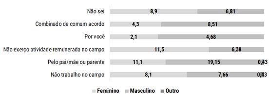 A opinião da jovem é desconsiderada não apenas pelo pai, o que evidencia uma barreira geracional, mas também pelos irmãos, fato que denota a reprodução de formas culturais machistas e da desigualdade de gênero nos espaços de decisão. Como extensão do que ocorre em relação ao planejamento, as jovens mulheres são igualmente excluídas das decisões sobre a remuneração do trabalho que realizam na roça das famílias, conforme mostra o Gráfico 1, a seguir: