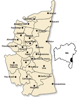 O Território Litoral Sul (Figura 3) é popularmente conhecido como Costa do Cacau. O cultivo deste produto representa mais de 40% da produção do estado, constituindo a principal cultura permanente do território (Território Litoral Sul, 2010). O TI é formado por 26 municípios, sendo Itabuna o município-sede e o eixo Ilhéus-Itabuna o mais economicamente dinâmico, industrializado e urbanizado. A rodovia Jorge Amado permite a ligação entre as duas cidades, que estão apenas a 33 km de distância uma da outra. Portanto, as comunidades que estão nas margens da rodovia possuem conexão rápida e barata com os mercados e serviços públicos.