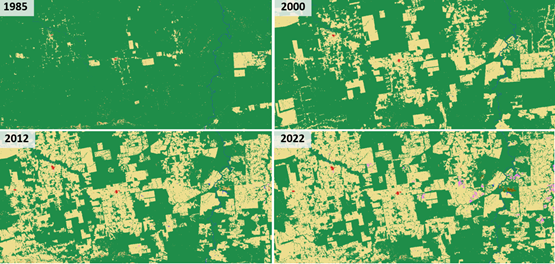 Figura 4 – Expansão das áreas agrícolas (em rosa) sobre as áreas de floresta (em verde) nos arredores do município de Sinop (Mato Grosso) entre 1985 e 2022