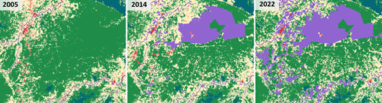 Figura 6 – Expansão das áreas de palma africana (em roxo) sobre as áreas de floresta (em verde) nos arredores de Pampa Hermosa (Peru) entre 2005 e 2022